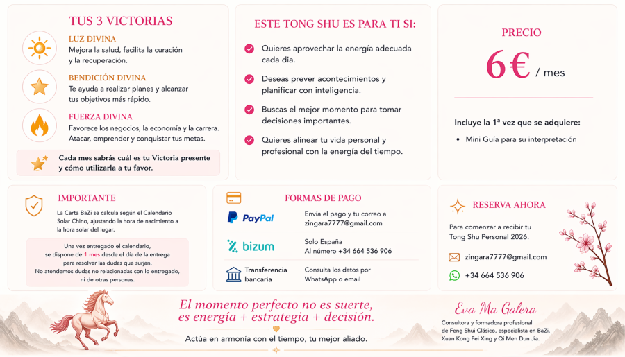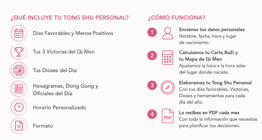 El Tong Shu Personal es un calendario basado en tu Carta BaZi y en tu Mapa de Qi Men de Palacio de Vida que te muestra, mes a mes, cuáles son los días más favorables y qué energías te acompañan.
